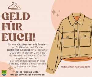 In diesem Jahr ist eine Oktoberfest-Garderobe im Kolkwitz-Center geplant. Die Einnahmen gehen an jene Vereine, die sich um die Garderobe kümmern wollen. Jetzt einfach formlos bewerben.