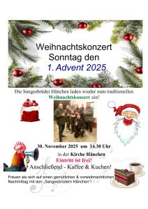 Das beliebte Adventsfest mit dem Hänchener Männerchor ist am 30. November 2025 in der Hänchener Kirche um 14.30 Uhr zu erleben. Nach dem Konzert lädt der Chor zu Kaffee und Kuchen ein.