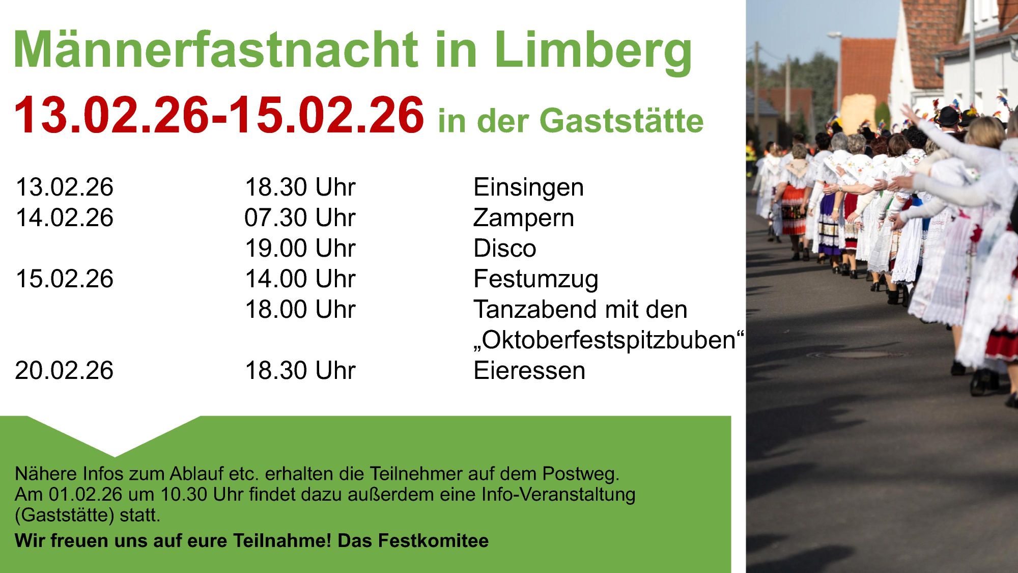 « Alle VeranstaltungenMännerfastnacht in Limberg13. Februar 2026 - 18:30 bis 15. Februar 2026 - 0:00« 1. Ausbildungsmesse in KolkwitzLesung mit Katharina Fuchs in der Gemeindebibliothek »+ Google Kalender+ Zu iCalendar hinzufügen Details Beginn: 13. Februar 2026 - 18:30 Ende: 15. Februar 2026 - 0:00 Veranstaltungskategorie:Allgemein