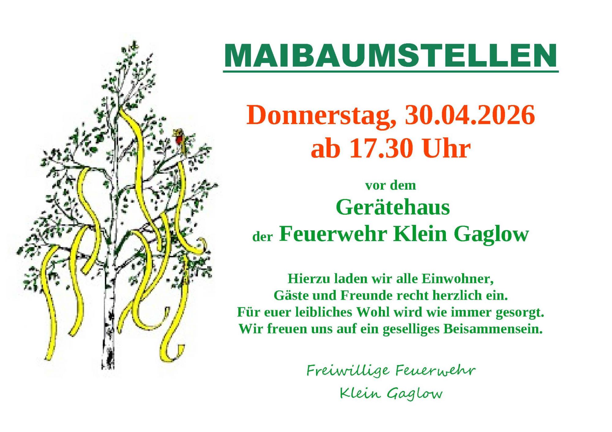 « Alle VeranstaltungenMaibaumstellen in Klein Gaglow30. April - 17:30« Frühlingskonzert des Volkschores Kolkwitz95 Jahre Feuerwehr Kunersdorf »+ Google Kalender+ Zu iCalendar hinzufügen Details Datum: 30. April Zeit: 17:30Veranstaltungskategorie:Allgemein