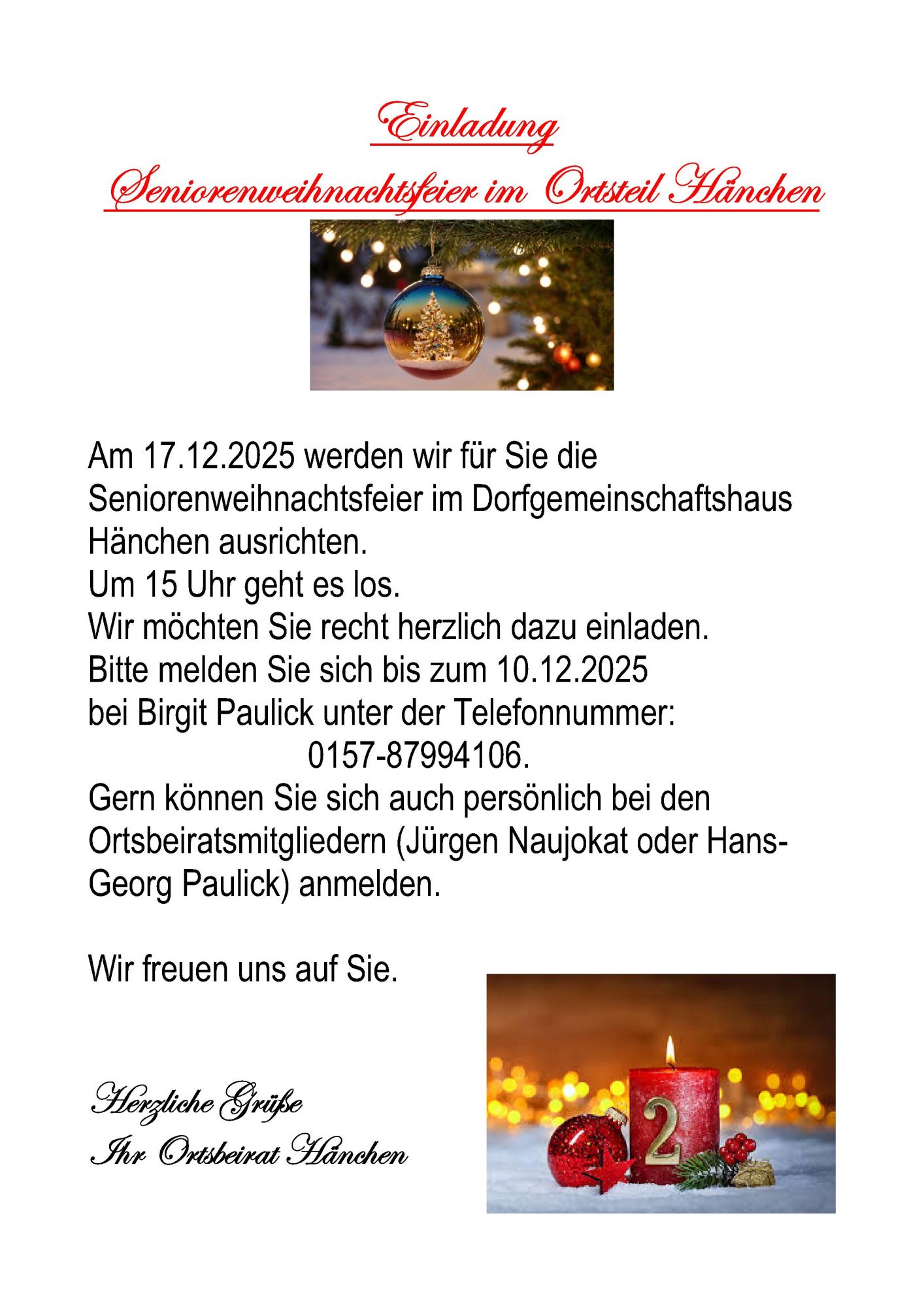 « Alle VeranstaltungenDiese Veranstaltung hat bereits stattgefunden.Seniorenweihnachtsfeier in Hänchen17. Dezember 2025 - 15:00« Weihnachtskonzert des Volkschores Kolkwitz e. V.Kartenverkauf Gaglower Karnevalverein »+ Google Kalender+ Zu iCalendar hinzufügen Details Datum: 17. Dezember 2025 Zeit: 15:00Veranstaltungskategorie:Allgemein
