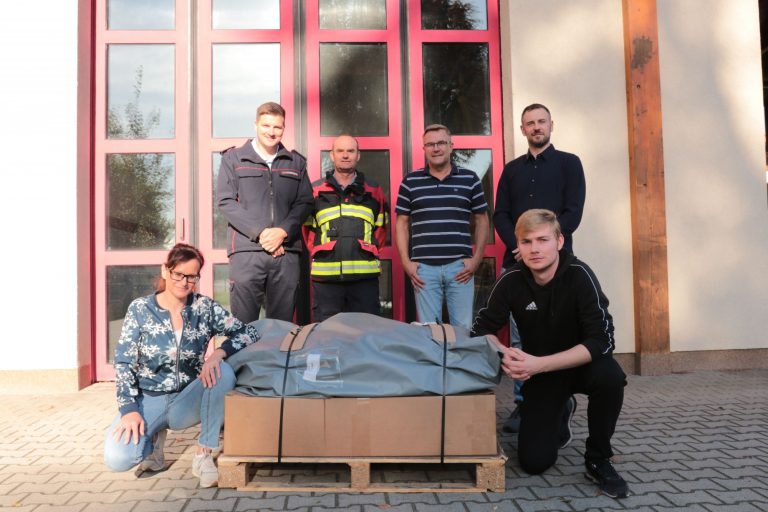 Über ein 10×6 Meter großes Mannschaftszelt kann sich die Jugendfeuerwehr der Gemeinde Kolkwitz freuen. Mit Eigenmitteln der Gemeinde und den Sponsoren SpreeGas, der Sparkasse Spree-Neiße sowie Stöber-Bau konnten die über 6000 Euro kurzerhand gestemmt werden. Ein herzliches Dankeschön an die finanziellen Unterstützer! Das 59 Quadratmeter große Zelt in Empfang nahmen v.l.: Manuela Kersten (Fachbereichsleiterin Ordnung & Sicherheit der Gemeinde Kolkwitz, Alexander Nerlich (Gemeindejugendwart), Steffen Theiler (Gemeindewehrführer), Karsten Schreiber (Bürgermeister Gemeinde Kolkwitz) sowie Frank Schütze und Marvin Gräfe (beide Mitarbeiter Ordnung &Sicherheit der Gemeinde Kolkwitz). Foto: Gemeinde Kolkwitz