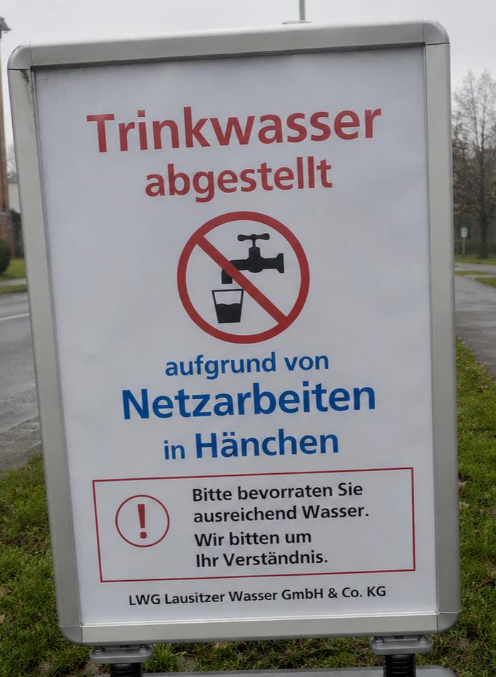 Aufgrund von notwendigen Netzarbeiten an der neuen Trinkwasserleitung wird die Wasserversorgung am Montag, 4. Mai 2026, von 8 bis 16 Uhr im gesamten Ort Hänchen vorübergehend unterbrochen.